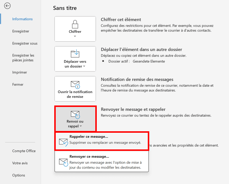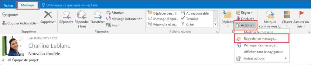 Vous verrez apparaître l’option « Renvoyer et Rappeler » ou simplement « Actions » selon votre version. Cliquez dessus, puis sélectionnez « Rappeler ce message ».